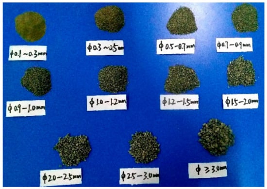 This experiment adopts the single factor control method. In order to ensure that the sand particle size of similar simulation materials is similar to the internal structure size of the rock, excessively large sand particles were excluded from the simulation test. Meanwhile, sand particles below 4.0 mm were selected and sieved with 0.1, 0.3, 0.5, 0.7, 0.9, 1.0, 1.5, 2.0, 2.5, and 3.0 mm meshes. The respective 11 particle size ranges and groups are depicted in Figure 2.