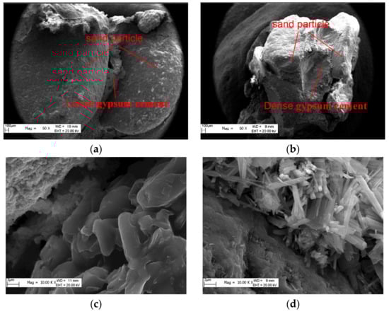 SEM observation results of a specimen with a larger sand diameter of 2.5 mm with a 60× magnification, as shown in Figure 5a, indicate that, after the hydration reaction, the sand particle structure is not dense enough, and the hydration cement product is loose, resulting in reduced specimen strength. As shown in Figure 5b, for the specimen with a smaller sand diameter of 1.0 mm, the hydration products between sand particles are denser and induce higher strength values. SEM observation results on hydration products between sand particles at the magnification of 10 K times are shown in Figure 5c: When the sand particle size was large, gypsum crystals developed into flake, layer, and plate shapes. These structures were relatively loose, which reduced the mechanical strength of the specimen. However, as shown in Figure 5d, when the sand particle size was small, needle-shaped and short, thick, rod-shaped crystals developed. The needle-shaped crystals could intertwine with each other to effectively overlap, thereby improving the shear strength of the specimen. The compressive strength of the specimen was also increased when the crystals were rod-shaped, because these were lined up orderly. The intertwinement of two crystals could produce higher overall strength.