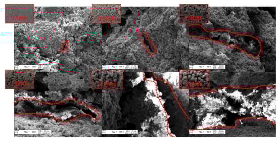 In order to investigate the internal microstructure of specimens, the cores of 0.1, 0.5, 1.0, 1.5, 2.0, and 2.5 mm specimens were subjected to SEM observations at magnification of 0.5 K. As shown in Figure 4, the specific surface area of sand was larger for the specimen with a smaller sand particle size. In the internal structure of specimens, the number of contact points between sand particles per unit volume increased, the contact area became larger, and the stress distribution was more uniform. The stress concentration at the interface was less probable, and thus, the specimen was less likely to be damaged. As the particle size of the sand increased, the microscopic pores formed between sand particles inside the specimen became larger. Under the same external force, the path of the force chain was singular, and it was easy to cause stress concentration that would cause damage to the specimen and reduce the material strength.