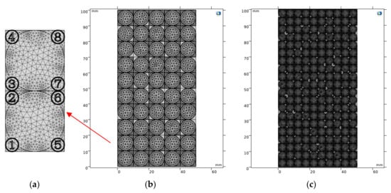 The numerical models of specimens with two (large and small) particle sizes were established using the COMSOL Multiphysics software package. The rectangular geometry of the two-dimensional model was used with reference to the maximum cross section of the specimen (100 mm in height and 50 mm in width). This rectangle was filled with circles, which represented sand particles. The model of large sand particles (of 5 mm in radius) contained 50 sand particles in total, while that of small sand particles (with radius of 2.5 mm) contained 200 sand particles. The total area of the sand particles was 1250π mm2, which ensured that the density and porosity ratio of both specimen models were the same.