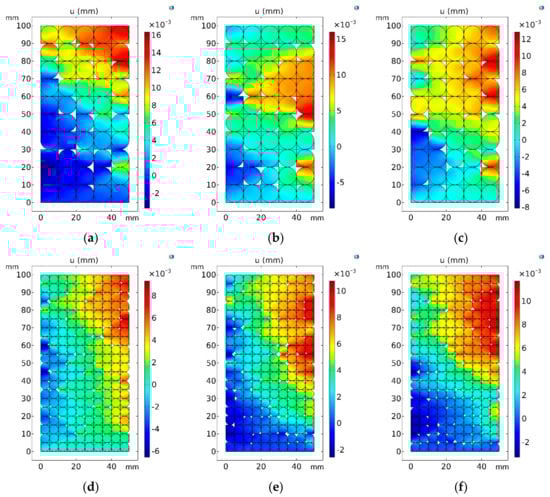 Distribution characteristics of horizontal displacement of specimens. (a–c) Distributions of horizontal displacement of large particle samples in three random simulation experiments; (d–f) Distribution of horizontal displacement of small particle samples in three random simulation experiments.