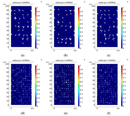 The major form of failure of the specimen after compression deformation is tensile failure. Therefore, the distribution of tensile stresses can be used to determine the probability of failure of the specimen under different particle size conditions. According to previous studies, the tensile strength of gypsum hydration reaction cement is 6.5–11.5 MPa [28]. This simulation used 10 MPa as the ultimate tensile strength of gypsum cement. Figure 8 shows the distribution of the area where the maximum principal stress in the selected specimen was tensile and exceeded 10 MPa. The area with a color close to the value 1 was considered to be the area where tensile failure may occur. It can be seen from Figure 11 that the internal tensile force of the specimen was mainly concentrated in the position with pores. From Figure 11a–c, it can be seen that the single area of the tensile stress concentration area formed under the condition of large particle size was larger and the number of distributions was smaller. The situation under the condition of large particle size was the opposite, as shown in Figure 11d–f. This shows that when the particle size was large, it was more likely to cause uneven distribution of the tensile stress concentration area in the specimen, which had a greater chance of causing the overall failure of the specimen.
