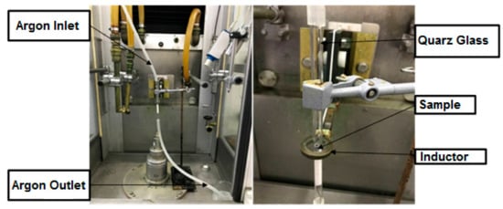 The samples were heat treated using two different heat treatment techniques: induction technology and conventional vacuum furnace. The induction experiments were carried out in an Induction hardening device of type VL 1000 of the company EFD Induktion GmbH. Due to the high oxygen sensitivity of Lanthanum, an oxygen-free system was set up and integrated into the induction system, which is shown in Figure 2.