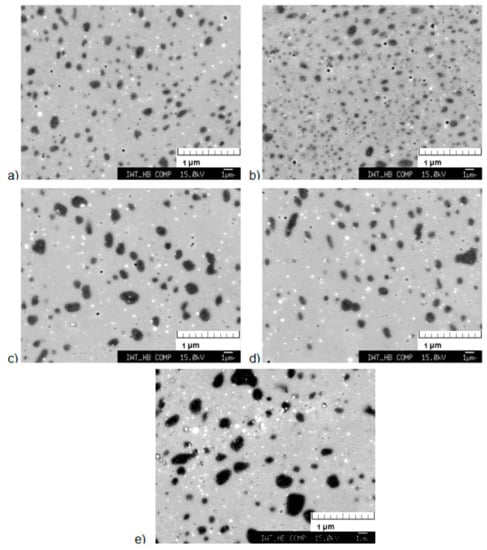 Figure 6 shows the comparison of the microstructure of the samples which were cooled by rapidly cooling the ceramics tubes (65 °C/min) and furnace cooled (10 °C/min). A clear effect of the cooling method on the microstructure is visible. The sample which was furnace cooled to room temperature shows a greater amount of 1:13 phase compared to the sample that was rapidly cooled. According to the magnetization measurements, the percentage of α-Fe in the sample that was furnace cooled is around 20 wt. %, compared to 25 wt. % for the rapidly cooled sample as given in Table 2. The researchers in [] investigated the influence of different cooling processes after high-temperature annealing of cast LaFe11.6Si1.4. Only a small influence of the cooling rate was reported and the highest amount of 1:13 phase was found after furnace cooling (95.3%), followed by air cooling (94%) and quenching in ice water (92.4%).