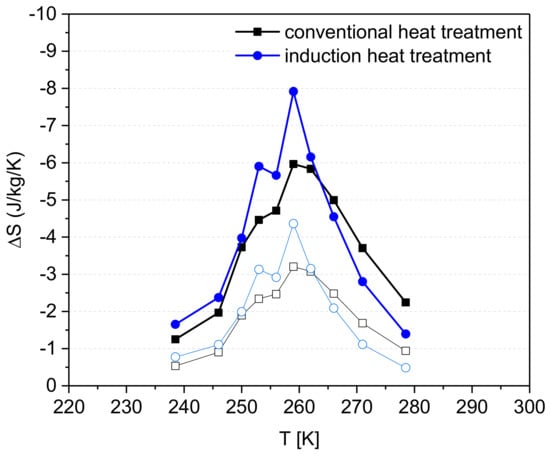 The magnetic entropy change (∆S) was determined from isothermal magnetization data each for the sample with the highest amount of 1:13 phase heat treated with conventional and induction technology. The curves of ∆S versus temperature in a magnetic field change of 0–1 T and 0–2 T for the samples “conventional heat treatment–1373 K–60 min–slow cooling” and “induction heat treatment–1373 K–15 min” are shown in Figure 8. As expected due to the higher percentage of 1:13 phase, ∆S is higher for the induction heat treated sample. The maximum entropy change is -7.9 J/kg/K (0–2 T) at 259 K. For the conventional heat-treated sample, the maximum ∆S is -6.0 J/kg/K (0-2 T), at the same temperature. The values are compared to ∆S reported in [] for LaFe11.28Si1.2Co0.52. With a volume fraction of 1:13 phase similar to this work (82%), a magnetic entropy change of about—6 J/kg/K was achieved for 2 T magnetic field change. However, the Curie-temperature determined in [] is significantly lower (around 240 K), despite the slightly higher Co-content. In accordance with that, in [] TC of LaFe11.4Si1.2Co0.4 is around 245 K. The shift in the Curie-temperature could be attributed to the oxygen content and the percentage of the α-Fe present in the samples after the heat treatment []. It is well-known that TC is proportional to x in La(Fe1-xSix)13. So, if the overall content of α-Fe increases, the content of Fe in the 1:13 phase decreases, hence the Si-content and, respectively, TC are increased. With an increased amount of oxygen, typically more La-oxide is formed, and La is not available for the formation of 1:13 phase. Hence, the content of α-Fe increases as well, and this leads to increase in TC.