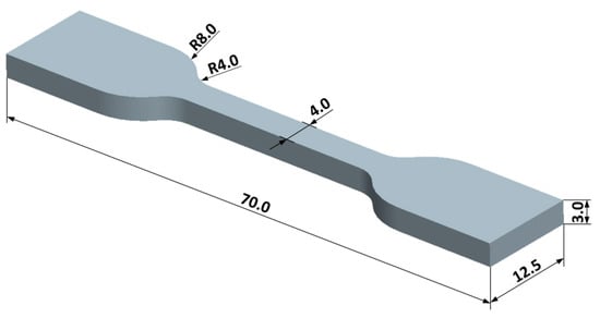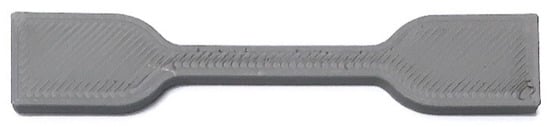 Material extrusion additive manufacturing trials were performed on an Original Prusa i3 MK3 fused filament fabrication machine (Prusa Research, Prague, Czech Republic). Nozzle diameter was 0.4 mm. The printing surface was a replaceable heated steel sheet. The printed parts were dog-bone specimens, as shown in the CAD image in Figure 1.