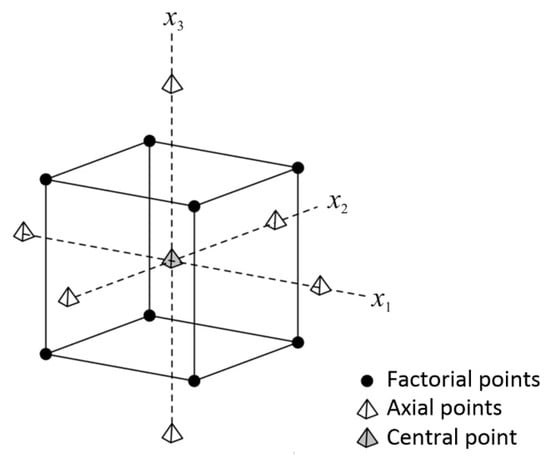 In the case of central composite design with three adjustable parameters, F is equal to 8 (23); therefore, the α value is 1.68. Therefore, design factors in coded form can be presented as −1.68, −1, 0, 1, and 1.68. Total numbers of trials in that case have to be 14 trials on design peaks and at axis and trials in the design center, where the design has repetitions for estimation of the model error.
