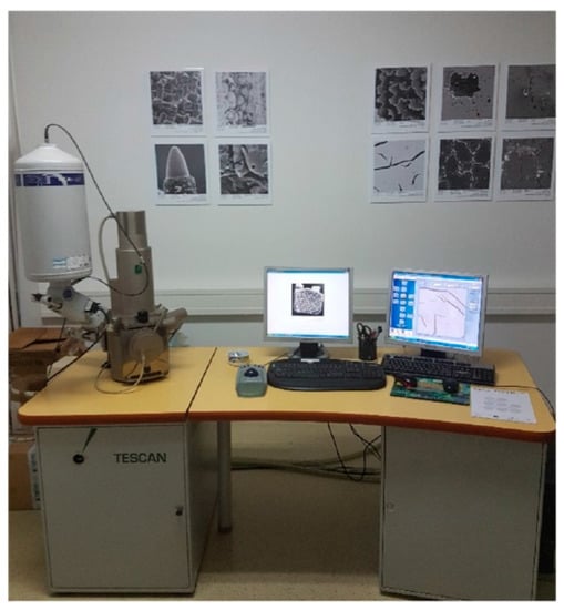 For green specimen structure analysis on the fracture surface, the scanning electron microscope Tescan Vega TS 5136 MM (Tescan S.r.o, Brno, Czech Republic) was used (Figure 4).