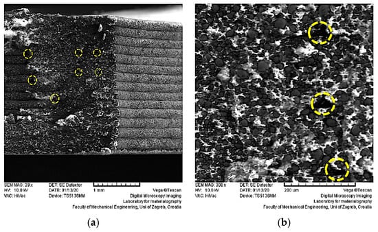 The microscopy images of the printed specimens show the printed layers (Figure 6a), which were of more or less constant dimensions. In each of the layers and the filament, the steel particles were well distributed and joint together by the polymeric binder (Figure 6b–d). Some pores due to the printing strategy (i.e., places where two perimeters joined or where the infill started and jointed) are visible in Figure 6a,b, and they are marked by dotted lines. This alignment of pores was observed in CT (Computed Tomography) scans of specimens produced by FFF with other highly filled filaments [], and they can lead to weaker mechanical properties (see Section 3.3).