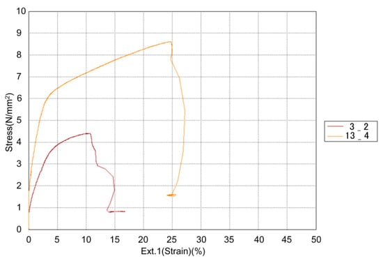 From Table 3, two different DoE trials can be pointed out: trial 3 with the lowest tensile properties, and trial 13 with the highest tensile properties. Figure 7 shows a tensile strength–strain (elongation) diagram for representative specimens from both trials: specimens 3_2 and 13_4. A very big difference can be seen in their tensile behavior, pointing out the importance of selecting the correct printing parameters.