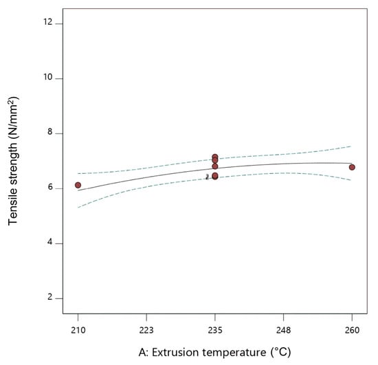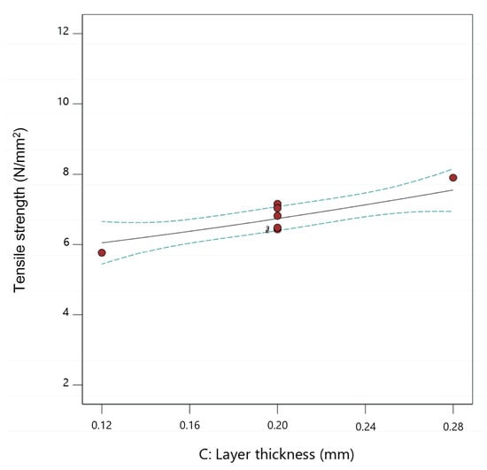 The influence of the extrusion temperature, flow rate multiplier, and layer thickness on the tensile strength of fabricated parts can be presented in the form of two-dimensional (2D) graphs (Figure 9, Figure 10 and Figure 11). While presenting individual parameter, the other two are maintained at mean values.