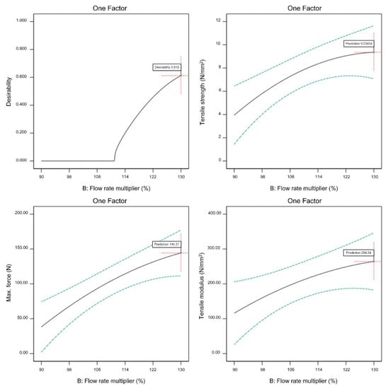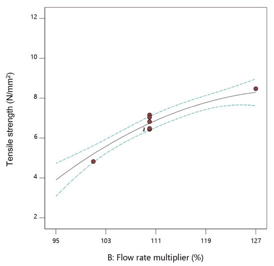 From Figure 9, Figure 10 and Figure 11, it can be concluded that increasing all three observed parameters individually led to an increase in tensile strength. Influence of the flow rate multiplier (Figure 10) was the most significant parameter here, as seen by the steeper slope of the curve.