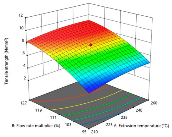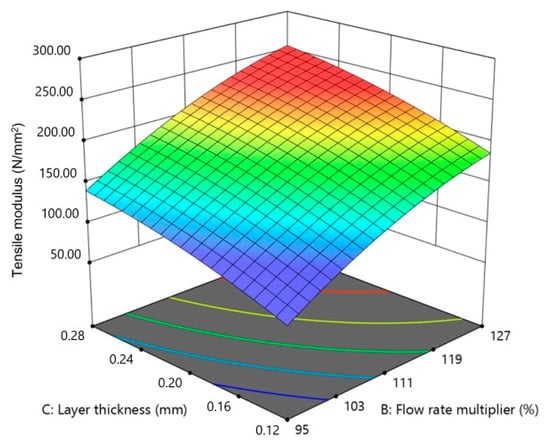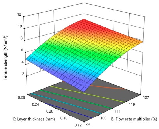 From Figure 12, Figure 13 and Figure 14, it can be concluded that the flow rate multiplier had the most significant effect on tensile strength. On Figure 12 and Figure 14, a significant increase in tensile strength can be seen upon increasing the flow rate multiplier in interaction with the extrusion temperature and layer thickness. The interaction of the other two parameters had a slight influence (Figure 13) on tensile strength; thus, the plotted surface area appeared almost flat.