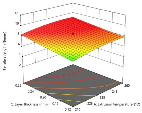 The 3D graph of the simultaneous influence of extrusion temperature and layer thickness on tensile strength (flow rate multiplier 127%).