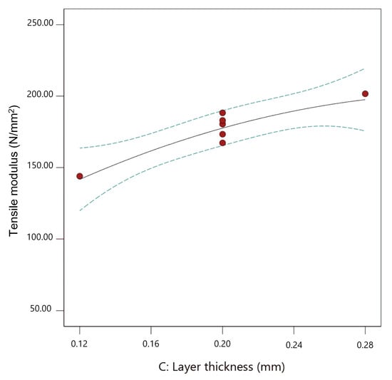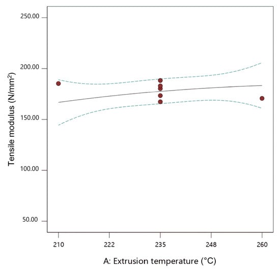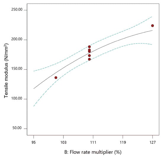 As the tensile modulus describes material behavior in the elastic area and presents a measure of the stiffness of the specimens, it is expected that a specimen printed with higher flow rate multiplier and with larger layer thickness would result in higher density and, as a result, stiffer specimens. Extrusion temperature also had the same effect (Figure 15); however, in this case, it was not significant.