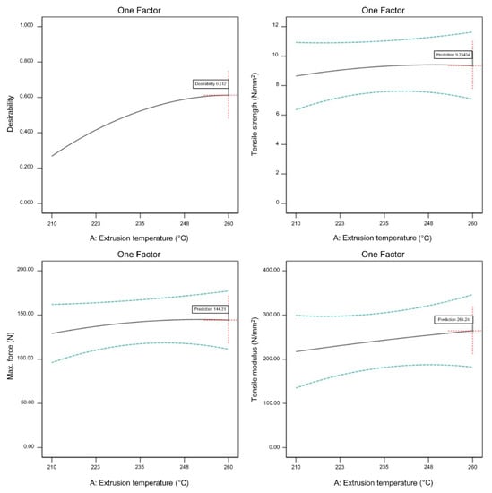 In order to set the FFF parameters for the production of specimens with optimal properties, the criteria for optimization have to be determined (Table 7). Here, complex optimization based on multiple simultaneous criteria was used. The limits of the expected tensile properties, shown in Table 7, were set according to the results obtained from the previous DoE analyzed in Section 3.3.