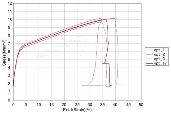 Table 9 presents the results of tensile testing, as well as variance from the estimated values. Figure 23 presents the tensile strength–strain diagram for the reprinted specimens (opt_1, opt_2 and opt_3), as well as the diagram of the average value (opt_av).