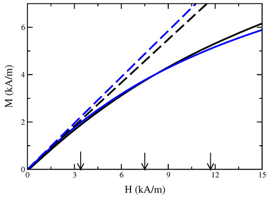 Experimentally measured magnetisation curve of EMG 909 (black solid line) and APG S21 (blue solid line), respectively, in the relevant range of H. Courtesy of K. May [17]. The black long-dashed (blue long-dashed) line indicates a linear law of magnetisation with () for EMG 909 (APG S21). The vertical arrows indicate the strength of the magnetic field at the rim of the wire at mm for A, 45 A and 70 A (from left to right).