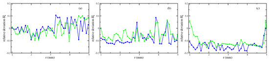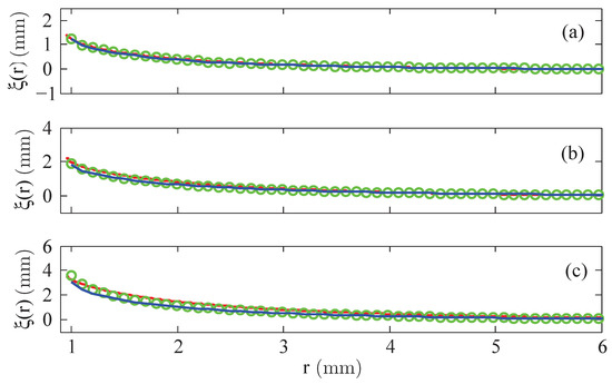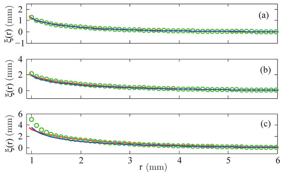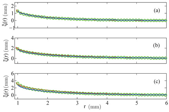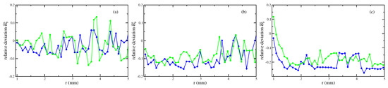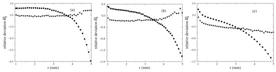 is calculated and plotted in Figure 8 for the three different strengths of the magnetic field using a nonlinear law of magnetisation. The upper limit of the considered range of r is determined by the fact that mm for the largest strength of the magnetic field. Such an elevation is given in [20] as the error in the experimental determination of vertical elevations. The overall picture is that three-dimensional calculations generate a clear smaller relative deviation, i.e., the experimental menisci are better matched. For mm, the deviation of two-dimensional calculations [19] starts to become rather large. This is because these calculations are much less able to fashion tiny surface elevations compared to three-dimensional calculations. Those deviations increase for mm compared to the range [best seen in Figure 8a,b], but keep clear smaller than the corresponding deviations for two-dimensional calculations.
