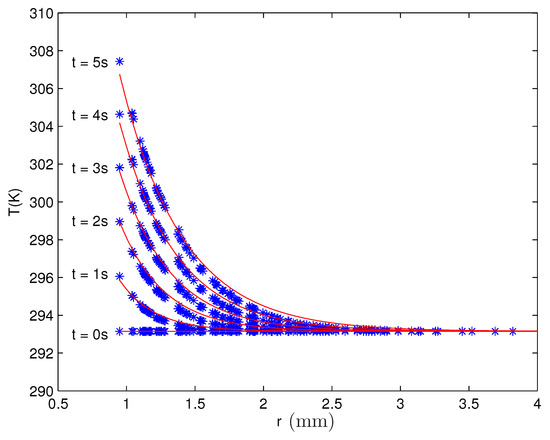 The radial distribution of temperature (the problem is axis-symmetric) shows Figure 11 for the case of the largest strength of the current, A, used in the experiments. The distribution towards the rim of the vessel follows an exponential decrease as the fits (see red lines) indicate. If one considers the temperature of the fluid just at the wire, it becomes clear that a significant increment happens. After an application of A over a span of time of s, the former room temperature of C reaches nearly C. Inspecting the case of s, the calculated temperature of C is close to the temperature of C measured with an infrared camera after 2 s in the experiment (see Figure 2 in [17]).