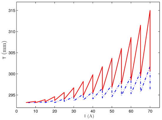Maximal temperature of the ferrofluid EMG 909 for a consecutive increase of the current from A to A by A. The waiting time between each increasing step counts to 300 s. The red solid line indicates the development of the temperature for a holding time of s at each strength of the current, and the blue dot-dashed one for s.