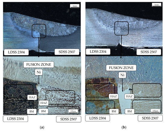 The constant development of various applications employing duplex stainless steels used in the chemical, petrochemical, nuclear, and energy industries, among others, demands the adaptation of materials that meet the required service conditions, thus, promoting the development of hybrid structures with dissimilar metals (i.e., welding between stainless steels) and combining their respective advantages. However, dissimilar metal welding is often accompanied by a series of problems, such as secondary phase formation, and the distribution of dissimilar metal weld in the fusion zone, which must be controlled [3,20].