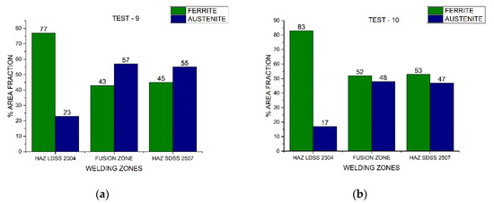 In Figure 10, Figure 11, and Figure 12, the area fraction of each phase in both stainless steels across the distinct welded zones was observed.