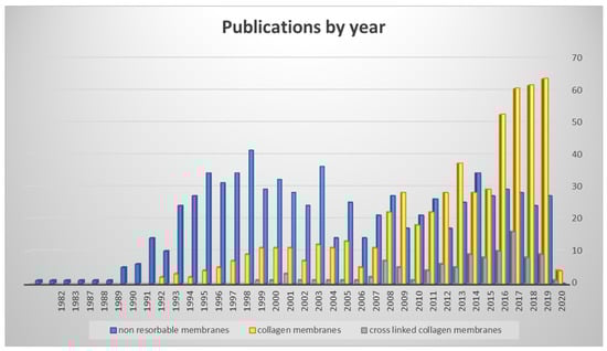 Researchers’ interest regarding non-resorbable membranes and collagen membranes varied during years. Nowadays, CM are the most employed and studied devices for bone regeneration for several indications, such as lateral bone augmentation, implant site development, ridge preservation and others [18,19,20]. Figure 1 shows the number of published articles by year for non-resorbable membranes, native collagen membranes, and cross-linked collagen membranes (Figure 1).