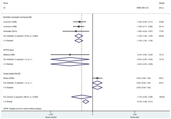 In a very recent systematic review [28] to test the evidence regarding the efficacy of lateral bone augmentation procedures, the most often used type of intervention for bone augmentation was the combination of a xenogeneic particulate grafting material with or without autogenous bone particles and a resorbable collagen membrane (CM). Meta-analyses using a native CM in conjunction with a xenogenic particulate grafting material as control treatment demonstrated that the defect height reduction was not significantly different compared to the combined data of the respective test groups (Figure 2). Significant differences, however, were observed in direct comparison with the second most common membrane, a non-resorbable ePTFE membrane in favor of CM for the primary outcome, vertical defect resolution [28]. These data were based on two included studies [13,40], and, since the use of an ePTFE membrane was considered to be the gold standard for GBR procedure at implant sites with dehiscence defects [18,28], have to be considered significant.