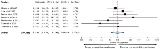 In terms of biocompatibility, tissue integration and postoperative complications the results of Garcia’s review suggest that non-cross-linked membranes present better results (Figure 3). The porous structure of non-cross-linked CM is suitable for the formation of transmembrane blood vessels, which may also facilitate membrane resorption [42].