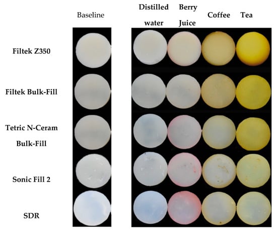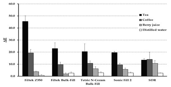 Many of investigations reported that tea was the most staining solution which is in agreement with findings from the current investigation [,,,]. This was followed by coffee and lastly berry juice produced the lowest values of ΔE (Figure 1 and Figure 2). Only SDR did not follow the same trend. However, a study by Ertas and collaborators reported that there was no significant different between coffee and tea in color change []. One reason for these differences could be the methods in which the solutions were prepared, which was not always clear in these investigations, as well as the duration and storage technique. We have decided to continuously store the specimens in the staining solutions throughout the period of the study to simulate long-term exposure to commonly consumed beverages. Based on this investigation and previous ones, it can be concluded that darker solutions can produce more color changes []. This can translate clinically into more chances for color changes of composite restorations in patients whose diets contain dark beverages such as tea, coffee, and red wine [,,].