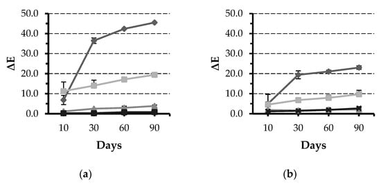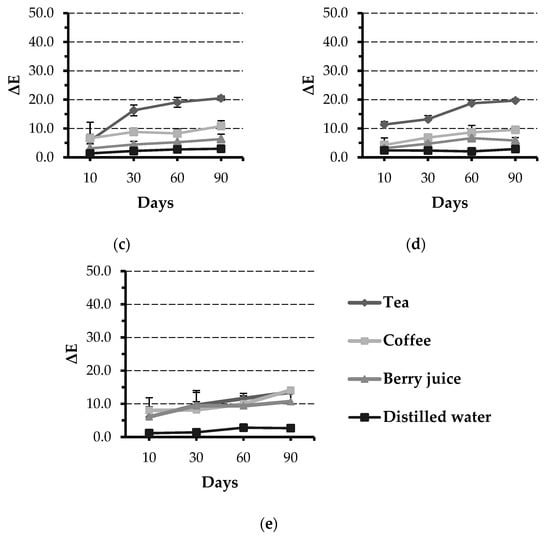 Values of ΔE continuously increased throughout the study period. However, the analysis of immersion time alone showed that the most pronounced color change occurred after 60 days (Figure 2). This time-dependent increase is in agreement with previous reports where samples exposed to the staining solutions for longer periods were associated with larger shifts in color irrespective of the type of solution used [,,].