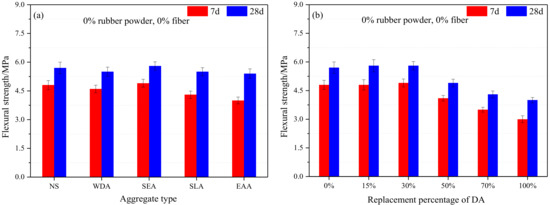 Figure 8 shows the effects of aggregate type, replacement percentage of DA, fiber, and rubber content on the flexural strength of cement mortar. Each flexural strength value corresponds to the average of three specimens.