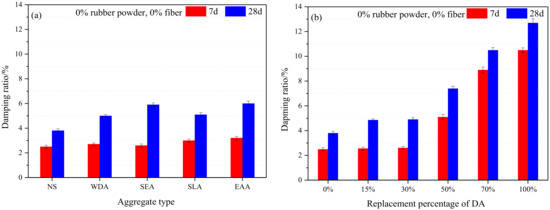 Figure 9 shows the effects of aggregate type, replacement percentage of DA, fiber, and rubber content on the damping ratio of the cement mortar. Each damping ratio value corresponds to the average of three specimens.