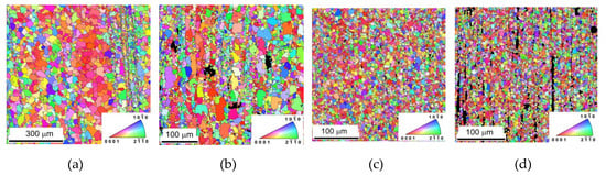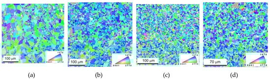 Electron back scatter (EBSD) inverse pole figures (IPF) calculated from Figure 1 for: (a) pure Mg, (b) Mg + 0.7 In718, (c) Mg + 1.4 In718, and (d) Mg + In718 (scale: blue to red).
