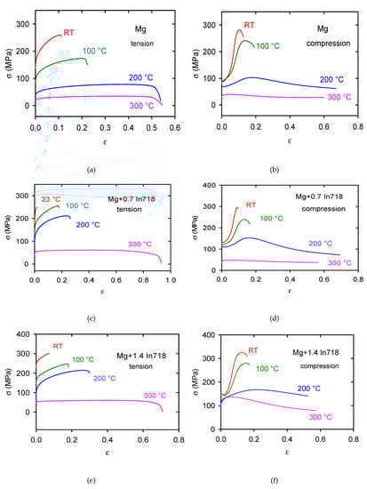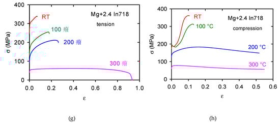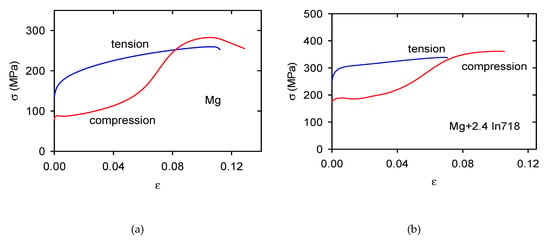 The stress–strain curves obtained in compression tests (see Figure 4b,d,f,h) exhibit a different character. For lower temperatures (RT-200 °C) the curves have the S-shape with a local stress maximum at strains 0.1–0.2. The tension–compression asymmetry of the flow curves is better to see in Figure 5a for pure Mg and Figure 5b for the Mg + 2.4 In718 sample. All curves were obtained at room temperature.