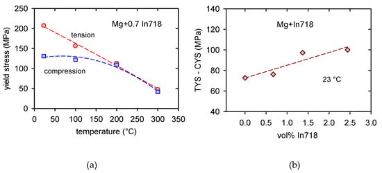 Tension–compression asymmetry: (a) TYS and CYS estimated for Mg + 0.7 In718 at various temperatures and (b) the difference between TYS and CYS estimated at room temperature depending on the vol.% of Inconel particles.