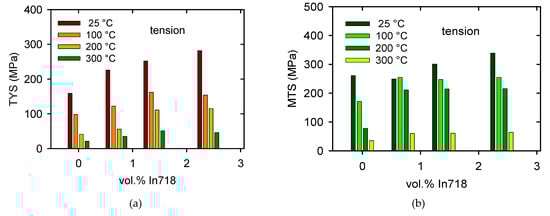 Characteristic stresses estimated for various particles’ content and temperatures in tension: (a) tensile yield stress (TYS) and (b) maximum tensile stress (MTS).