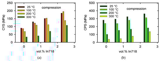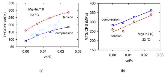 The temperature dependences of the TYS/CYS and MTS/CPS estimated for pure Mg are shown in Figure 7a,b. It is obvious that while the TYS and MTS decrease continuously with temperature, the CYS remains nearly constant at lower temperatures and then slowly decreases with temperature. The TYS and MTS estimated for all samples and temperatures are shown in Figure 8a,b, and the CYS and CPS are shown in Figure 9a,b. The TYS values estimated at room temperature increase with increasing volume fraction of In718 particles. At higher temperatures, TYS values slightly decreased for Mg + 2.4 In718. In compression tests the CYS estimated at 100 °C is slightly higher than the CYS measured at room temperature (RT) for Mg + 1.4 In718 and Mg + 2.4 In718. While in pure Mg, MTS rapidly decreases for temperatures higher than 100 °C, in samples containing In718 particles thermal stability was improved. The MTS values of composites at 200 °C were still higher than 200 MPa.