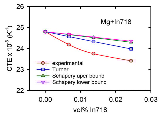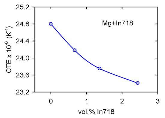 Figure 11 shows a decrease in the CTE with volume fraction of In718 particles. In the literature, there are several theoretical models [44,45,46,47] expressing the concentration dependence of the reinforcing phase on the CTE. If only hydrostatic stresses exist between phases in the composite simple, Turner’s relationship for the composite CTE can be written as follows [44]: