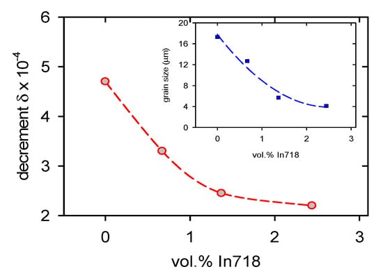 Similarly, the concentration dependence of the logarithmic decrement reported in Figure 11 decreases with an increasing volume fraction of the In718 particles. For comparison, the estimated decrease of the grain size is shown in the insert in Figure 11.