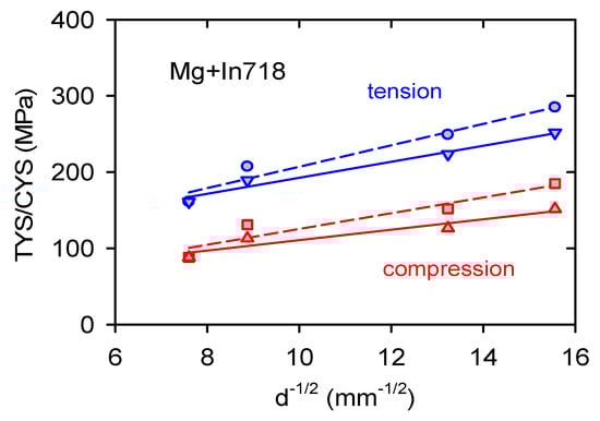 The experimental yield stress values obtained at room temperature were plotted against the grain size d−1/2 in Figure 15 (dash line). Two different dependences with the different slopes were found because of the tensile–compression asymmetry. The observed increase of the yield stresses with decreasing grain size represents Hall–Petch strengthening and a component reflecting the presence of Inconel particles in the magnesium matrix, Δσ: