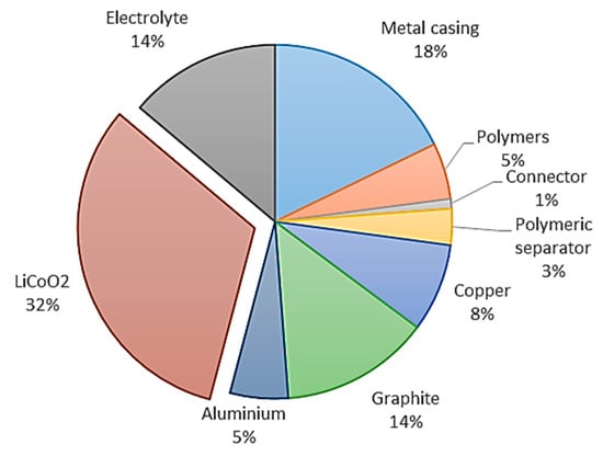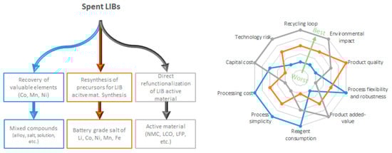 . Although the general objectives of recycling are to maximize the material recovery and economic value while minimizing the environmental impact, it also includes processes that focus on recovering only one target component from the whole battery system or degrade LIB components to different degrees of lower value products [48]. The term “downcycling” can be used to refer to this degradation process, whether deliberate or unintended, and is also designated as “open-loop” recycling in the literature [49]. The quality and inherent properties of a product that enters an open-loop recycling chain are undoubtedly altered. This arises from the cross-contamination with other type of materials, mixing various additive elements contained in similar materials, or the degradation of the physical and chemical properties of the recycled material. More specifically, downcycling is unintended when the qualities of a material have been degraded owing to its manipulation and processing. Conversely, downcycling is deliberate when the purpose of the process is to return the material to its more simple or elementary form. Thus, to reverse such decrease in quality, recycling should include additional costly purification steps. For example, Ni and Co alloys are recovered when Co- and Ni-based LIBs are processed together with ore concentrate in a smelter like Glencore’s Sudbury (Canada) facilities. The Co and Ni alloy requires additional hydrometallurgical treatment before it can be used for synthesis of fresh cathode compounds suitable for manufacturing new LIBs.4.1. Currently Used Recycling Processes