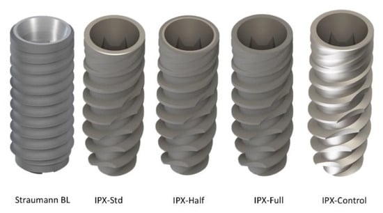 - Type V: IPX-Control, with 3.5 mm diameter and 8 mm in length (Galimplant SLU, Sarria, Lugo, Spain), with implant body, neck, and platform machined (mean Ra value of 0.28 µm).