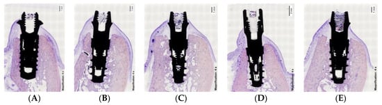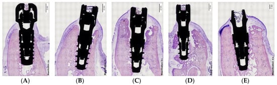 Histological images of immediate implants. (A) Straumann BL; (B) IPX-Std; (C) IPX-Half; (D) IPX-Full; (E) IPX-Control.