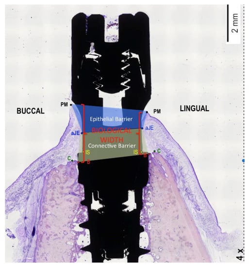 These topographic references (Figure 5) were used to measure the following linear parameters (mm): The supracrestal soft tissue height (the distance between PM and B); the epithelial attachment length (the distance between PM and aJE); the connective adaptation heights (the distance between aJE and B); and the marginal bone loss (the distance between IS and B). In addition, the percentage of bone-to-implant contact (BIC) was measured in both the buccal and lingual sides of the implants.