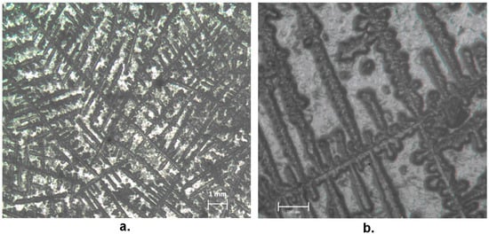 In general terms, the use of cladode material, which is worn out and therefore with a high level of maturity, would imply the presence in it of high levels of calcium salts, as suggested e.g., in [18]. In practice, the possible use of nopal mucilage dispersion to produce edible gels, which requires sufficient strength, despite its viscoelastic behavior, does depend on the combined presence of gel-promoting cations, such as Ca2+, with sucrose, resulting in calcium-rich polysaccharides, generally defined as pectins [19]. This gives a strong gelling capacity, defined as the presence of “egg-box” junctions [20]. The optical micrographs of the dried mucilage samples did indicate the presence of very regular three-dimensional structures, of dendritic type, as revealed from Figure 5. Previous studies had been reported that the content of calcium not included in ashes in nopal mucilage is close to 10%, mainly represented by calcium oxalates [21].