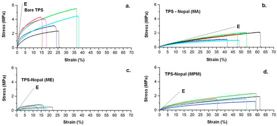 Tensile curves of thermoplastic starch (TPS) (a.) and its blended films with nopal mucilage (MA film (b.), ME film (c.), MPM film (d.)). Colors represent the curves for the different samples tested.