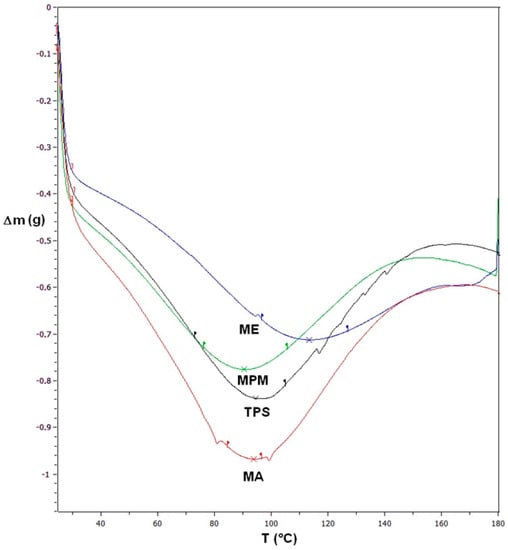 Thermoplastic starches rich in glycerol, like the one used in this investigation, which has a starch/glycerol ratio of 2.5, have characteristically a glass transition temperature below ambient temperature, which means having a thermal transition temperature depending on melting of crystallites [24]. This was determined by DSC (curves are reported in Figure 10 and results are given explicitly with an accuracy of ±0.5 °C in Table 3). It appears that the insertion of nopal mucilage tends in the case of ME films to shift the thermal transition towards higher temperatures, which would in principle extend the usability of the material, though on the other side, its mechanical performance does constitute another limitation. Less significant are the differences obtained in the cases of other blended films, MA and MPM.