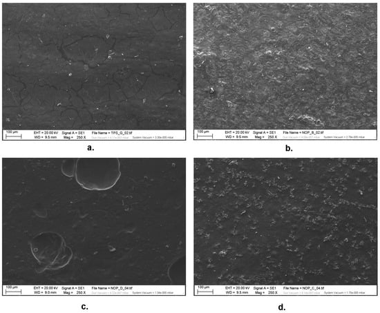 SEM images of TPS film (a.) and its blended films (type MA (b.), type ME (c.) and type MPM (d.)). Magnification: 250×.